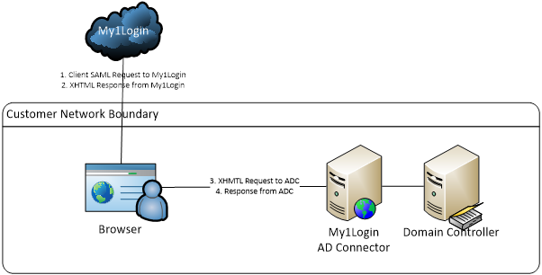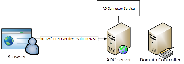 The following diagram illustrates the settings used in this document: the server hostname will be “adc-server”, domain is “dev.my1login” and the ADC will be assumed to be on its default port of 47810.