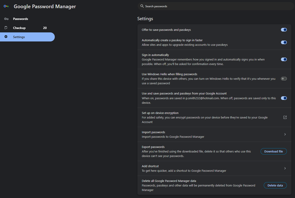 - Click on the Settings option in the left hand pane and in the section that says Export passwords, click Download file and save the file as a comma separated value (.csv) file