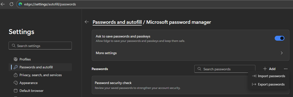 - On Edge, go to “Passwords and autofill” and select Edge Password Manager