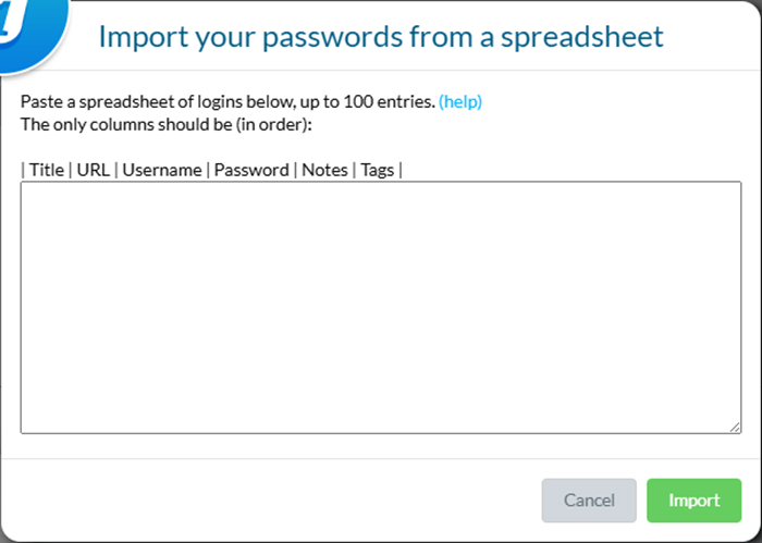 - Copy out the spreadsheet by highlighting the fields of the contents you wish to import and pasting them into the field.